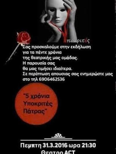 Την Πέμπτη η ομάδα των Υποκριτών γιορτάζει με μία εκδήλωση τα 5 της χρόνια