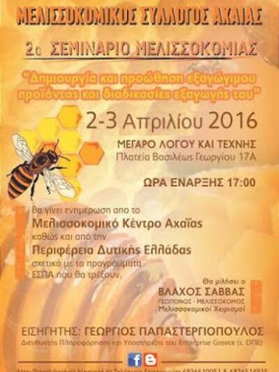 Ο Μελισσοκομικός Σύλλογος Αχαΐας διοργανώνει, ένα διήμερο σεμινάριο στις 2 και 3 Απριλίου 2016, στην αίθουσα του Μεγάρου Λόγου και Τέχνης.