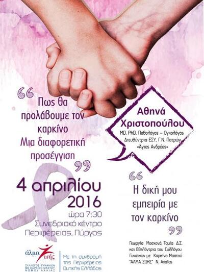 Τίτλος της ημερίδας είναι «Πως θα προλάβουμε τον καρκίνο- Μια διαφορετική Προσέγγιση», το  θέμα θα αναπτύξει η κα Αθηνά Χριστοπούλου, MD, PhD, Παθολόγος-Ογκολόγος  Διευθύντρια ΕΣΥ, Γ.Ν. Πατρών Άγιος Ανδρέας.