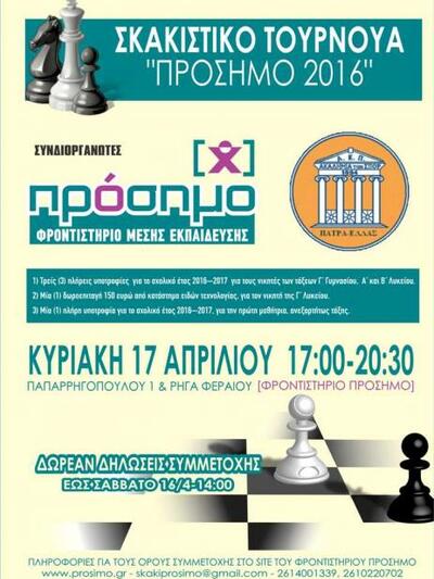 Το τουρνουά θα διεξαχθεί την Κυριακή 17/04/2016 και ώρα 17.00 στις αίθουσες του φροντιστηρίου ΠΡΟΣΗΜΟ, στη διεύθυνση Παπαρρηγοπούλου 1 & Ρήγα Φεραίου.