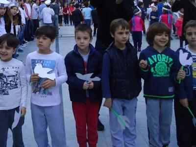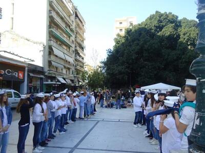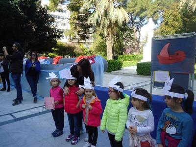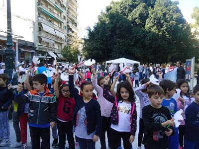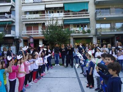 Με «οικοδεσπότες» τα μεγαλύτερα παιδιά της Ε και ΣΤ Τάξης που φορούσαν ναυτικά καπελάκια, κατέφθασαν «σκηνοθετημένα» και διαδοχικά όλες οι άλλες τάξεις του σχολείου, φορώντας ή κρατώντας χάρτινα περιστέρια και μεταφέροντας ένα οικουμενικό μήνυμα ειρήνης και αγάπης. “Aν όλα τα παιδιά της γης», “We are the World» και άλλα τραγούδια πλασίωσαν την εκδήλωση που στόχευε σε συγκέντρωση τροφίμων και αναγκαίων προμηθειών για τους πρόσφυγες αλλά και σε μια «διαφορετική» διαδήλωση κατά του πολέμου. Ο τίτλος της εκδήλωσης ήταν «Βάρκα ανθρωπιάς... σε μια θάλασσα αλληλεγγύης για το άγνωστο προσφυγόπουλο». Οι σακούλες με τις προσφορές των παιδιών και των οικογενειών τους κατέληγαν συμβολικά σε φουσκωτή βάρκα που είχε τοποθετηθεί στην πλατεία.