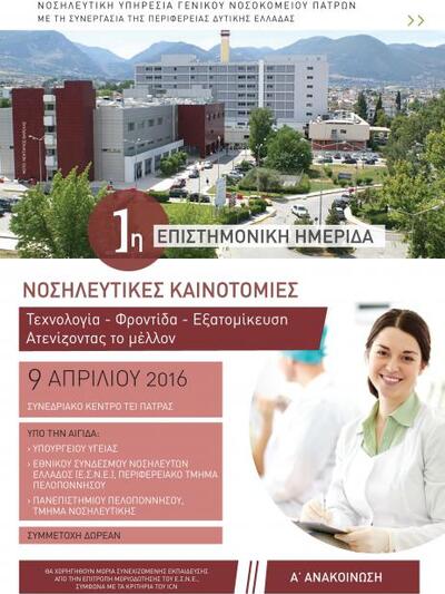 Η Νοσηλευτική Υπηρεσία του Γενικού Νοσοκομείου Πατρών θα πραγματοποιήσει την 1η Επιστημονική Ημερίδα με τίτλο: ''Νοσηλευτικές Καινοτομίες: Τεχνολογία-Φροντίδα-Εξατομίκευση. Ατενίζοντας το μέλλον'' η οποία θα πραγματοποιηθεί στις 09/04/16, ημέρα Σάββατο και ώρα 9.00πμ στο Συνεδριακό κέντρο του ΤΕΙ Πάτρας σε συνεργασία με την Περιφέρεια Δυτικής Ελλάδας.