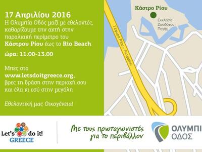 Εθελοντές από τον Πολιτιστικό Σύλλογο «Ζωοδόχος Πηγή» στο Ρίο, τον Ποδηλατικό Όμιλο Πάτρας και πολλοί άλλοι την Κυριακή από τις 11.00-13.00 θα καθαρίσουν την ακτή περιμετρικά του Κάστρου Ρίου έως το ξενοδοχείο Ρίο Beach.