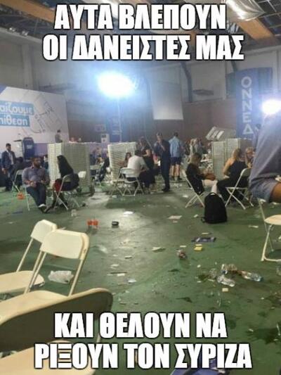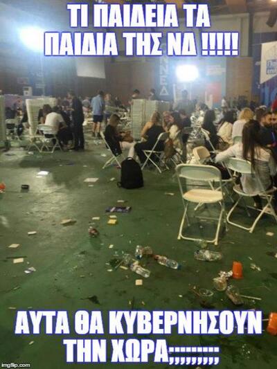 Μια φωτογραφία από το συνέδριο της ΟΝΝΕΔ που έγινε στην Αθήνα, κάνει το γύρο του διαδικτύου από το πρωί. Όπως φαίνεται στη φωτογραφία, το στιγμιότυπο έχει ληφθεί μετά τη λήξη των εργασιών και το εντυπωσιακό στοιχείο αποτελούν τα σκουπίδια που βρίσκονται στο δάπεδο. Το στιγμιότυπο έχει δώσει τροφή για σχόλια στους χρήστες του διαδικτύου, όχι και τόσο κολακευτικά για τους νέους της ΝΔ.
