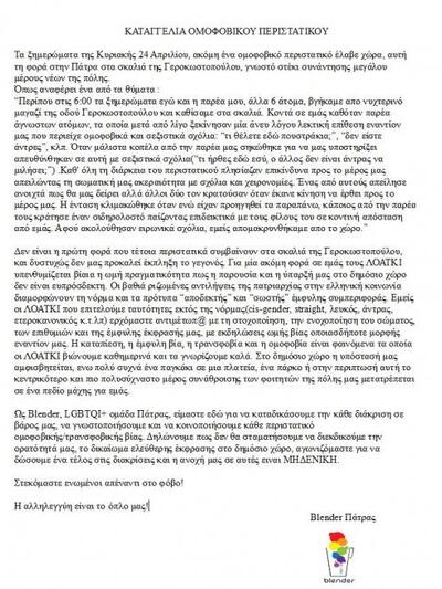 Ένα τέτοιο χαρακτηριστικό περιστατικό λεκτικής βίας σημειώθηκε το βράδυ της περασμένης Κυριακής και καταγγέλθηκε στην ομάδα Blender Patras.