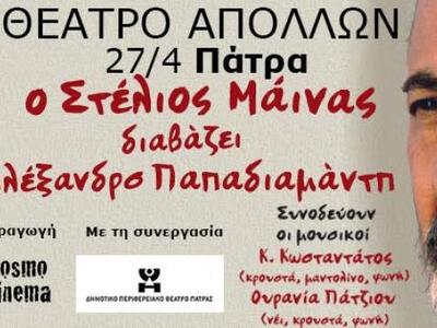 Ξεχωριστή αναμένεται η θεατρική βραδιά στην οποία ο γνωστός ηθοποιός Στέλιος Μάινας θα διαβάσει Αλέξανδρο Παπαδιαμάντη, την Μ. Τετάρτη 27 Απριλίου 2016, στις 21:00 στο Δημοτικό Θέατρο Απόλλων, στην πλατεία Γεωργίου Α’.