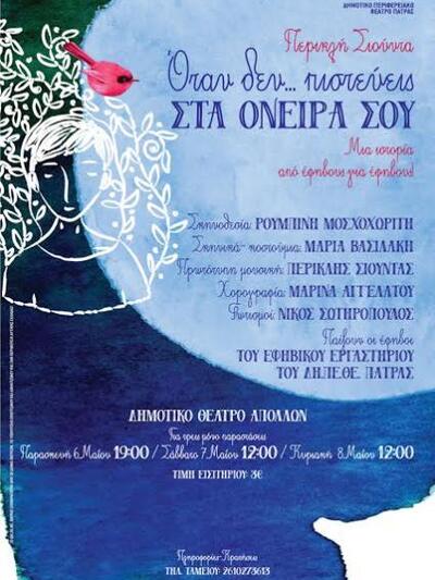 To Θεατρικό Εργαστήρι Παιδιών και Εφήβων του Δημοτικού Περιφερειακού Θεάτρου Πάτρας παρουσιάζει την θεατρική παράσταση με τίτλο Όταν δεν…πιστεύεις στα όνειρά σου. Μια ιστορία από έφηβους για έφηβους, που πήρε το πρώτο βραβείο στον περσινό διαγωνισμό συγγραφής εφηβικού έργου.