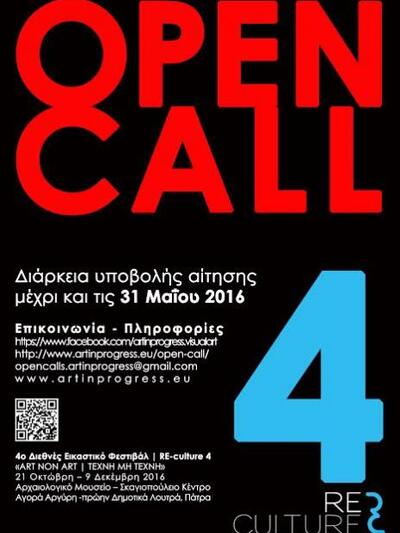 Το 4o Διεθνές Εικαστικό Φεστιβάλ Πάτρας RE-culture 4 επιθυμεί να υποστηρίξει την ευρύτερη αναζήτηση των νέων εικαστικών που ζουν στην Ελλάδα. Στην προσπάθεια αυτή, προκηρύσσει ανοιχτό κάλεσμα/open call σε πολλές από τις θεματικές του.