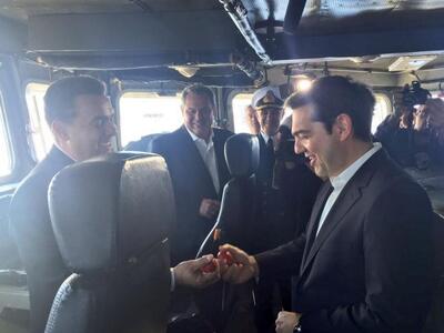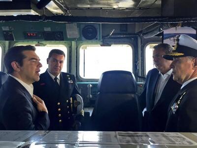 Ο πρωθυπουργός ξεναγήθηκε στους χώρους της φρεγάτας και αντάλλαξε ευχές με τους αξιωματικούς και το πλήρωμα.