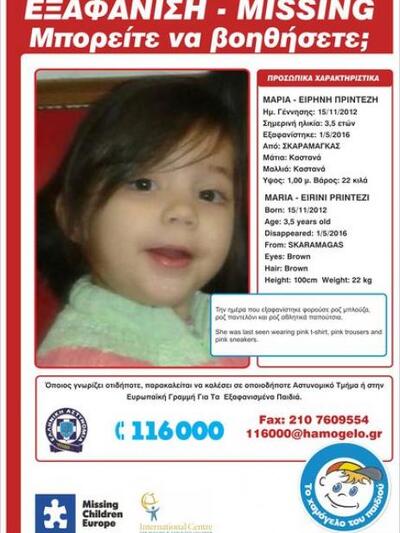 Σύμφωνα με ανακοίνωση του Χαμόγελου του Παιδιού, η μικρή Μαρία - Ειρήνη Πρίντεζη αγνοείται από το μεσημέρι της Κυριακής του Πάσχα. Έχει καστανά μακριά μαλλιά, καστανά μάτια, ύψος 1,00 μέτρο και ζυγίζει 22 κιλά. Φορούσε ροζ μπλούζα, ροζ παντελόνι και ροζ αθλητικά παπούτσια. Λόγω της ηλικίας της και των συνθηκών εξαφάνισης υπάρχουν ενδείξεις ότι το παιδί κινδυνεύει.