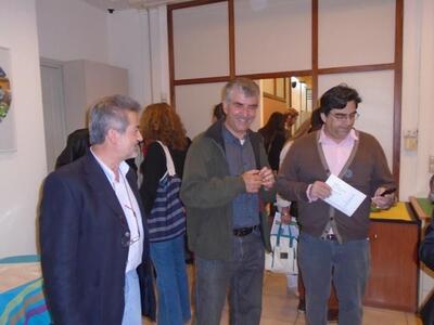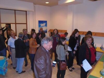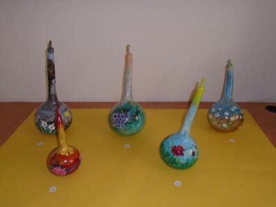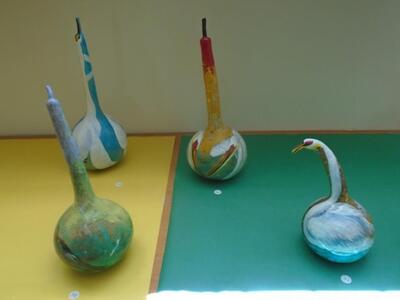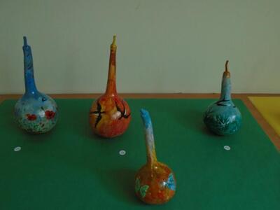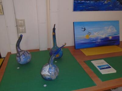Οι συμμετέχοντες θαύμασαν τα πρωτότυπα ζωγραφικά έργα του καλλιτέχνη, πάνω σε νεροκολοκύθες τις οποίες καλλιεργεί ο ίδιος, και τα οποία απεικονίζουν θέματα παρμένα από την ελληνική φύση.