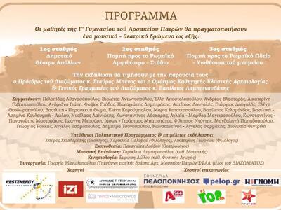 Αξίζει να σημειωθεί πως το παραπάνω πολιτιστικό πρόγραμμα του Αρσακείου σχολείου της Πάτρας γίνεται σε συνεργασία με τo τμήμα Πολιτιστικών προγραμμάτων Β/θμιας Εκπαίδευσης Αχαΐας, με την Εφορεία Αρχαιοτήτων Αχαΐας καθώς και με την κίνηση Πολιτών «Διάζωμα».