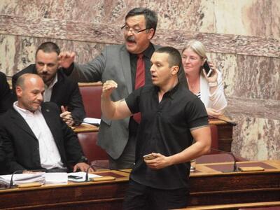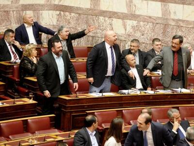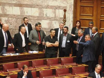ΝΩΡΙΤΕΡΑ: «Ασπίδα» γύρω από τον Γ. Λαγό σχημάτισαν οι βουλευτές της Χρυσής Αυγή προκειμένου να μην τον αποπέμψει η φρουρά της Βουλής ύστερα από την σχετική εντολή του προεδρεύοντως Γιώργου Λαμπρούλη.