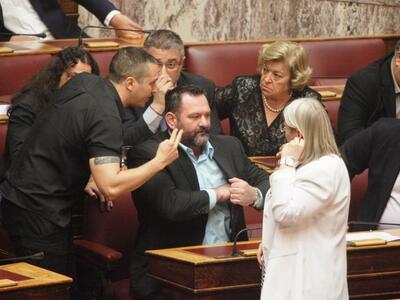 Κάποια στιγμή ο Ηλ. Κασιδιάρης βγήκε έξω από την αίθουσα μιλώντας στο κινητό του και ρωτώντας «έχει φαγωθεί ο Βούτσης να τον βγάλει από την αίθουσα. Τι προβλέπεται;». «Α, τρεις παρατηρήσεις», είπε ο βουλευτής της Χρυσής Αυγής και επανήλθε στην Ολομέλεια, όπου ο Γ. Λαγός συνεχίζει να κάθεται στο έδρανό του.