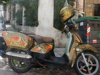 Την φωτογράφησε ο Αλέξης Γκλαβάς στην διασταύρωση των οδών Αλεξάνδρου Υψηλάντου και Καλαμογδάρτη. Μπορεί να είναι σταματημένη δίπλα σε κάδο, αλλά η vespa- υπερπαραγωγή, δεν χάνει την...τσαχπινιά της. Το ασορτί animal print κράνος, απλά μας ξεπερνάει.