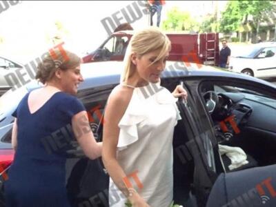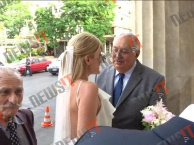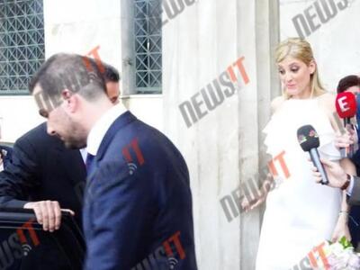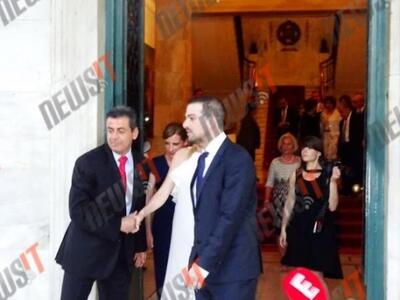 Με το χαμόγελο ζωγραφισμένο στα πρόσωπά τους, μπήκαν χέρι χέρι στο δημαρχείο για να ξεκινήσει η τελετή. Η γνωστή δημοσιογράφος είχε επιλέξει ένα άσπρο φόρεμα που έκρυβε επιμελώς την φουσκωμένη κοιλίτσα της και είχε αφήσει τα μαλλιά της κάτω. Ο γαμπρός επέλεξε λευκό πουκάμισο και μπλε σακάκι. Και αυτή τη φορά, δεν εμφανίστηκε... χωρίς γραβάτα!