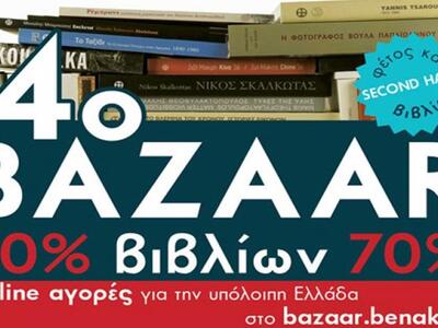 Το 4ο Bazaar Βιβλίων του Μουσείου πραγματοποιείται στο κτήριο της οδού Πειραιώς, για τους κατοίκους της Αθήνας από Πέμπτη 19 Μαϊου μέχρι και την Κυριακή 22 Μαϊου αλλά από φέτος καθιερώνονται οι online αγορές το ίδιο τετραήμερο, για κόσμο από ολη την επικρατεια. Οι τιμές είναι εντυπωσιακά χαμηλές για μία σειρά τόσο σημαντικών εκδόσεων.