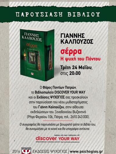 Ο Φάρος Ποντίων Πατρών,το Βιβλιοπωλείο DISCOVER YOUR WAΥ και οι Εκδόσεις ΨΥΧΟΓΙΟΣ παρουσιάζουν το νέο μυθιστόρημα του Γιάννη Καλπούζου  με τίτλο «Σέρρα. Η Ψυχή του Πόντου».