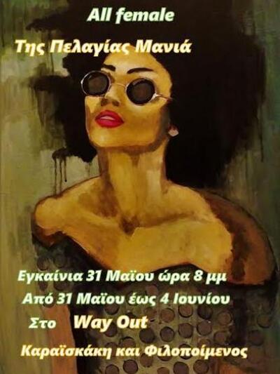 Την ερχόμενη Tρίτη 31 Μαΐου 2016 θα εγκαινιαστεί η έκθεση ζωγραφικής της Πελαγίας Μανιά με τίτλο «Αll Female», στο χώρο του καφέ «Way Out» στην οδό Καραϊσκάκη και Φιλοποίμενος, στην Πάτρα.
