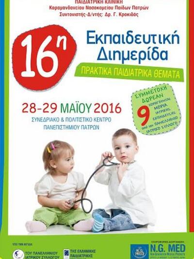 Η 16η Εκπαιδευτική Διημερίδα – Πρακτικά παιδιατρικά θέματα της Παιδιατρικής Κλινικής του Καραμανδανείου Νοσοκομείου Παίδων Πατρών θα διεξαχθεί στο Συνεδριακό Και Πολιτιστικό Κέντρο του Πανεπιστημίου Πατρών, στο Ρίο στις 28-29 Μαΐου 2016.