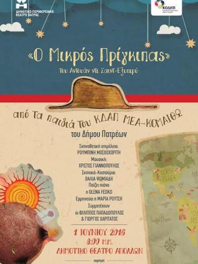 Τα παιδιά του ΚΔΑΠ ΜΕΑ ΚΟΜΑΙΘΩ του Δήμου Πατρέων παρουσιάζουν τοόμορφο, ποιητικό και τρυφερό έργο «Μικρός Πρίγκιπας» του Αντουάν ντε Σαιντ- Εξυπερύ στο Δημοτικό Θέατρο Απόλλων, στην πλ. Γεωργίου Α’, την Τετάρτη 1η Ιουνίου 2016, στις 20.00.