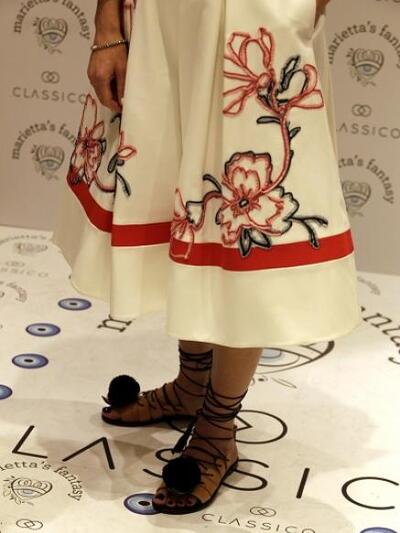 To brand ίσιων σανδαλιών της Χρουσαλά, είναι εμπνευσμένο από τη μυθολογία και την αρχαιότητα. Σε ταμπά, μαύρο, χρυσό διαθέτει διάκοσμο με φύλλα, φούντες, πόρπες, παραστάσεις από τοιχογραφίες, που γοήτευσαν το κοινό. Γνωστές συμπολίτισσες του εμπορικού, επιχειρηματικού, επιστημονικού κόσμου ανταποκρίθηκαν στην πολύ όμορφη, ανάλαφρη εκδήλωση. Ανάμεσά τους και ο πρώην δήμαρχος Ευάγγελος Φλωράτος. Στο εσωτερικό του Classico, είχε στηθεί πάτωμα και διαφημιστική "πλάτη" σε άσπρους και μπλε τόνους ως φόντο για τα απαραίτητα φλας ενώ προσφέρονταν κοκτέιλ και μεζεδάκια. Εκεί σε δράση και ειδικός τεχνίτης που χάραζε στα σανδάλια το όνομα της κάθε πελάτισσας. Επί της υποδοχής σύσωμη η οικογένεια Γαβρίλη Σταυρόπουλου που καλωσόρισε άπαντες με χαρά. Η ίδια η Χρουσαλά, με λευκό απλό φορεματάκι και ένα από τα δικά της σανδάλια σε άσπρο-μπλε, δεν μίλησε τόσο στο μικρόφωνο για τη φίρμα της, που διακινείται επιλεκτικά σε Ελλάδα και εξωτερικό, αλλά για τη γνωριμία της με τους καταστηματάρχες, πριν λίγα χρόνια στο Μιλάνο. Γνωριμία που εξελίχθηκε σε προσωπική φιλία και αμοιβαία εκτίμηση. Η βραδιά κράτησε ως τις 10 περίπου και μετά ακολούθησε κλειστό δείπνο για τη Μαριέτα στο Distinto του Ρίου.