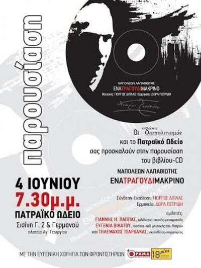 Ένα βιβλίο –cd για τον Ναπολέοντα Λαπαθιώτη, με τον τίτλο Ένα τραγούδι μακρινό, έφτιαξε ο Πατρινός συνθέτης Γιώργος Δίπλας με την Δώρα Πετρίδη στο τραγούδι.