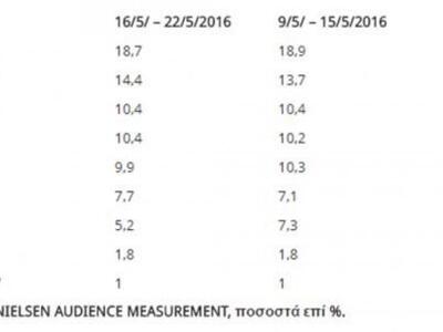 Την τρίτη θέση μοιράζονται ο ΣΚΑΪ και το Star με 10,4%. Το Ε-TV με 7,7% εξακολουθεί να διατηρείται σε υψηλά επίπεδα.