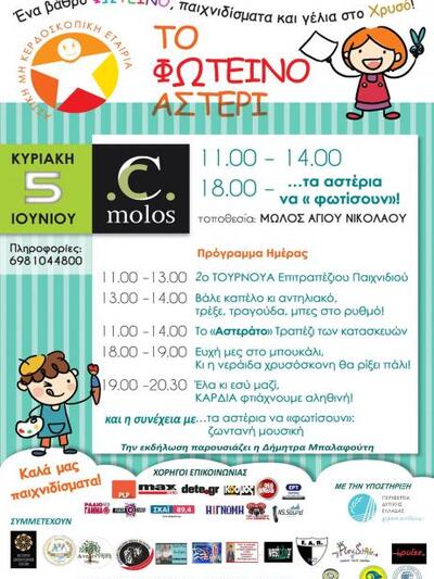 Την Κυριακή 5 Ιουνίου 2016 στο Μόλο Αγίου Νικολάου διοργανώνεται το Εργαστήρι του Φωτεινού Αστεριού με διάφορες θεματικές ενότητες και δράσεις για παιδιά και μεγάλους που αισθάνονται παιδιά. Σε ανακοίνωση των διοργανωτών αναφέρονται τα εξής: