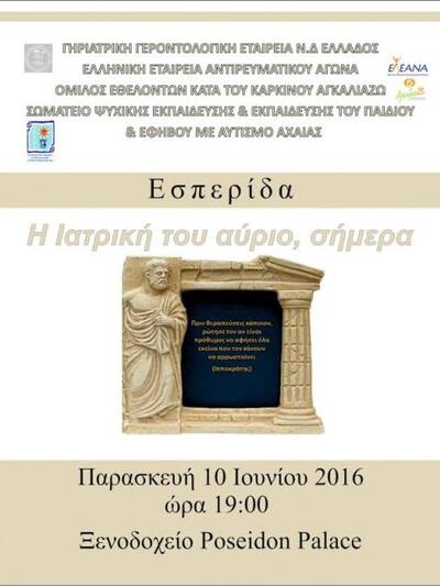Η Γηριατρική –Γεροντολογική Εταιρεία Ν.Δ Ελλάδος, η Ελληνική Εταιρεία Αντιρευματικού Αγώνα, ο Όμιλος Εθελοντών κατά του Καρκίνου Αγκαλιάζω και το Σωματείο Ψυχικής Εκπαίδευσης και Εκπαίδευσης του Παιδιού και Εφήβου με Αυτισμό Αχάιας διοργανώνουν Εσπερίδα με θέμα: "Η Ιατρική του Αύριο, Σήμερα" την Παρασκευή 10 Ιουνίου και ωρα 18.30 στο Ξενοδοχείο POSEIDON PALLACE ΣΤΑ Καμίνια Αχάιας .