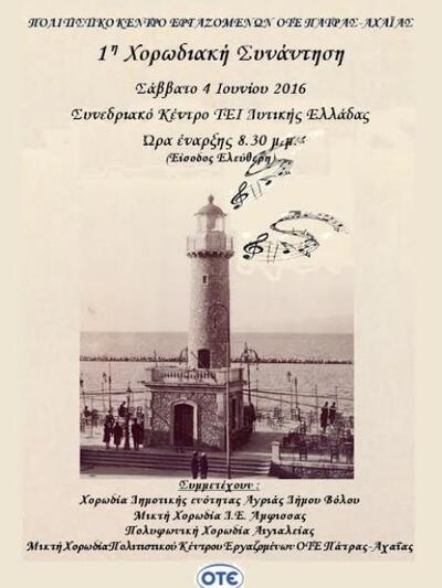 Το Πολιτιστικό Κέντρο Εργαζομένων ΟΤΕ Πάτρας-Αχαΐας, διοργανώνει την 1η Χορωδιακή Συνάντηση, αυτό το Σάββατο 4 Ιουνίου 2016, στο Συνεδριακό Κέντρο του ΤΕΙ Δυτικής Ελλάδας, στο Κουκούλι, στην Πάτρα.