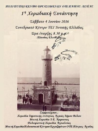 Πρόκειται για την 1η Χορωδιακή Συνάντηση, που θα γίνει αυτό το Σάββατο, 4 Ιουνίου 2016, στο Συνεδριακό Κέντρο του ΤΕΙ Δυτικής Ελλάδας, στο Κουκούλι.