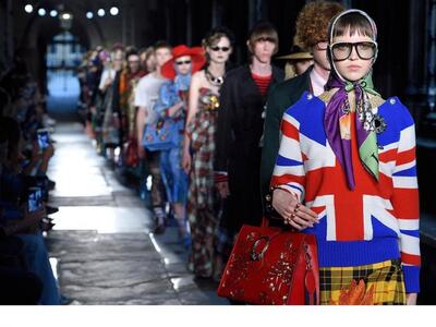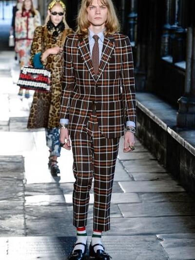 Aνδρες και γυναίκες μοντέλα έγιναν βρετανοί της Gucci στυλιστικής φαντασίας. «Mπλέχτηκαν» χαρούμενα και δημιουργικά όλα τα στοιχεία της αγγλικής ενδυματολογικής και πολιτισμικής κουλτούρας στον υπερθετικό.