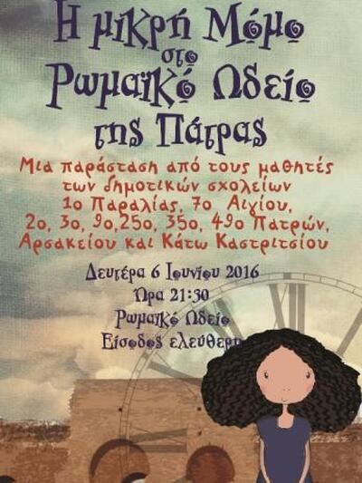 Το Πολιτιστικό Δίκτυο της Πρωτοβάθμιας εκπαίδευσης  σε συνεργασία με το ΔΗ.ΠΕ.ΘΕ. Πάτρας παρουσιάζουν την θεατρική παράσταση Η μικρή Μόμο στο Ρωμαϊκό Ωδείο της Πάτρας την Δευτέρα 6 Ιουνίου και ώρα 21:30.