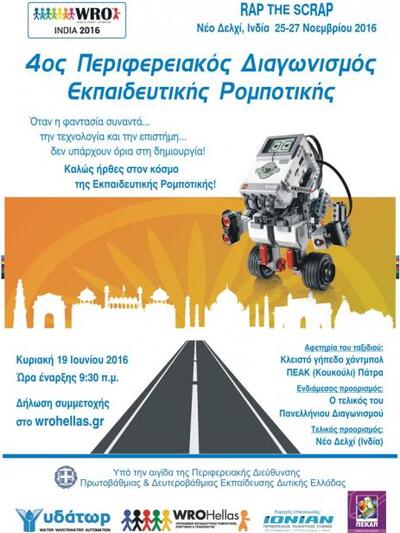Ο 4ος Περιφερειακός Διαγωνισμός Εκπαιδευτικής Ρομποτικής Δυτικής Ελλάδας διεξάγεται υπό την αιγίδα της Περιφερειακής Διεύθυνσης Πρωτοβάθμιας και Δευτεροβάθμιας Εκπαίδευσης Δυτικής Ελλάδας (ΠΔΕΔΕ) & συνδιοργανώνεται με τον Οργανισμό Εκπαιδευτικής Ρομποτικής & Επιστήμης W.R.O™ Hellas, στο κλειστό γήπεδο χάντμπολ (ΠΕΑΚ Πατρών – Κουκούλι), στις 19 Ιουνίου 2016. Ήδη 20+ ομάδες από σχολεία της Δυτικής Ελλάδας έχουν δηλώσει συμμετοχή και οι εγγραφές συνεχίζονται.