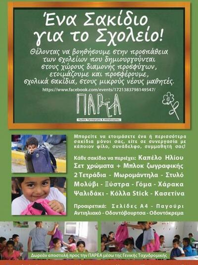 Τώρα που το σχολικό έτος τελειώνει, είναι ευκαιρία τα παιδιά να γεμίσουν το παλιό τους σακίδιο τους με σχολικά είδη και να το προσφέρουν σε έναν συνομήλικό τους πρόσφυγα. Οι δομές εκπαίδευσης και δημιουργικής απασχόλησης των προσφυγόπουλων που λειτουργούν στα κέντρα φιλοξενίας αξίζουν την στήριξή μας.