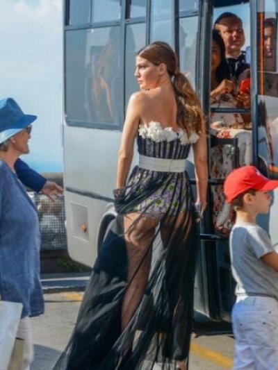 Ονειρεμένο το couture στράπλες νυφικό Alexander Mc Queen με μπούστο σαν γλυπτό και φουσκωτή φούστα από αμέτρητα φρου-φρου μουσελίνας που σχηματίζαν φαντασμαγορική "ουρά". (Mιλάμε για δημιουργία –αξιοθέατο κατάλληλη για μουσείο μόδας) Στο κεφάλι ένα ογκώδες «διάδημα» από πέρλες και λουλούδια. To μυστήριο τελέστηκε στο πανοραμικό σημείο Faro di Punta Carena με φόντο πελώρια βράχια και το γαλάζιο της Μεσογείου, με τις καλεσμένες να κρατούν για τον ήλιο παραδοσιακές ομπρέλες απο δαντέλα. Μετά την τελετή η φοβερά κεφάτη νύφη αφαίρεσε τη μεγάλη φούστα μένοντας με μια άλλη, εσωτερική πτυχωτή φούστα για να χαιρετήσει, ενώ λίγο μετά για να χορέψει φόρεσε δεύτερο νυφικό, ένα δαντελένιο μίνι Giambattista Valli με ψηλές ασορτί μπότες.