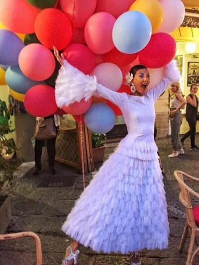 Τα προηγούμενα βράδια η 37χρονη Τζοβάνα Μπατάλια εμφανίστηκε με vintage κόκκινο κιμονό Mugler και με ένα απίστευτο λευκό φόρεμα Alaia με φτερά που ανέδειξε με σπανιόλικο styling και παπούτσια με κορδέλες Aquazzura στη γραφική Piazzetta του Κάπρι. Εκεί όλοι διασκέδασαν με ζωντανή μουσική, πολύ χορό ανάμεσα στα πολύχρωμα μπαλόνια.