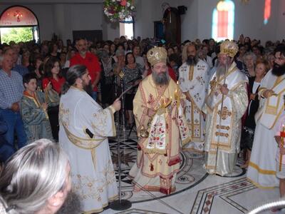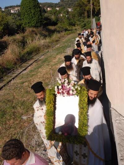 •Τήν παραμονή ἒγινε ἡ κατάθεσις τῶν Ἱερῶν Λειψάνων ἀπό τόν Σεβασμιώτατο Μητροπολίτη Πατρῶν κ.κ. Χρυσόστομο καί ἐν συνεχείᾳ ἐτελέσθη ὁ Μέγας Ἑσπερινός, χοροστατοῦντος τοῦ Σεβασμιωτάτου Μητροπολίτου Πατρῶν. Συγχοροστάτησαν οἱ Σεβασμιώτατοι Μητροπολίτες, Ἀτλάντας κ. Ἀλέξιος καί Βελεστίνου κ. Δαμασκηνός καί ὁ Θεοφιλέστατος Ἐπίσκοπος Κερνίτσης κ. Χρύσανθος.