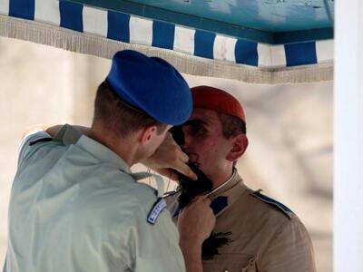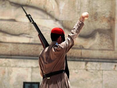 Παρά τους 40 βαθμούς που έδειξε το θερμόμετρο το μεσημέρι του Σαββάτου στο κέντρο της Αθήνας οι τσολιάδες της προεδρικής φρουράς παραμένουν όρθιοι, μπροστά στο άγαλμα του Αγνώστου Στρατιώτη. Οι Εύζωνοι υποφέρουν όχι μόνο από την ορθοστασία και την πλήρη ακινησία, αλλά και από τις βαμβακερές στολές που φορούν, οι οποίες κάνουν τη ζέστη ακόμη πιο αποπνικτική.