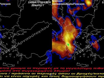 Προς το παρόν σας παραθέτω δύο σενάρια εξέλιξης του καιρού, σύμφωνα πάντα με τα τελευταία προγνωστικά στοιχεία, αρχικά για το Σάββατο, όπου στο πρώτο σενάριο φαίνεται η δυτική κυρίως Ελλάδα να επηρεάζεται από έντονα καιρικά φαινόμενα ενώ στο δεύτερο σενάριο δείχνει να επηρεάζονται κατά τη διάρκεια του ίδιου 24ωρου από αυτά και αρκετές περιοχές της κεντρικής και βόρειας Ελλάδας"!