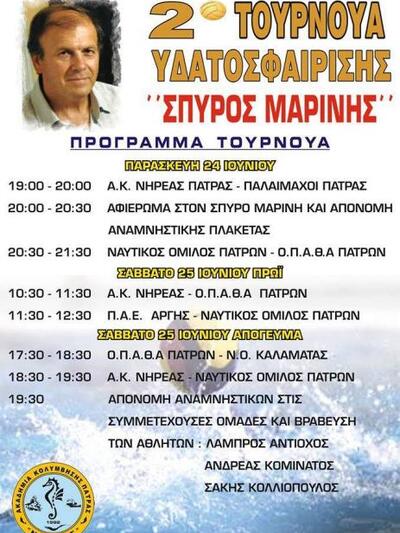 Τουρνουά πόλο στη μνήμη του Σπύρου Μαρίνη θα διοργανώσει και φέτος ο Νηρέας Πατρών, από αύριο μέχρι και την Κυριακή. Οι αναμετρήσεις θα πραγματοποιοηθούν στο κολυμβητήριο "Α. Πεπανός" το επόμενο τριήμερο.