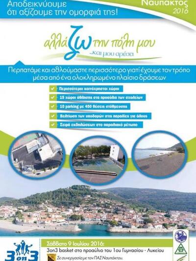 Ο Δήμος Ναυπακτίας, στο πλαίσιο της καμπάνιας του «ΑλλάΖΩ την πόλη μου… και μου αρέσει», ανοίγει την αυλαία των εκδηλώσεων με τη διοργάνωση τουρνουά «3on3 basket» στο προαύλιο του 1ου Γυμνασίου- Λυκείου, το Σάββατο 9 Ιουλίου. Το τουρνουά θα πραγματοποιηθεί σε συνεργασία με την ομάδα του ΠΑΣ Ναυπάκτου, και θα δώσει την ευκαιρία σε μικρούς και μεγάλους να απολαύσουν τη χαρά του παιχνιδιού σε ένα νέο πνεύμονα άθλησης που απέκτησε η πόλη.