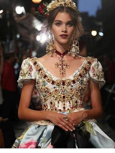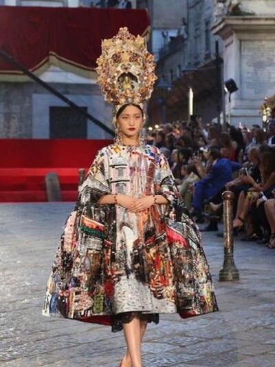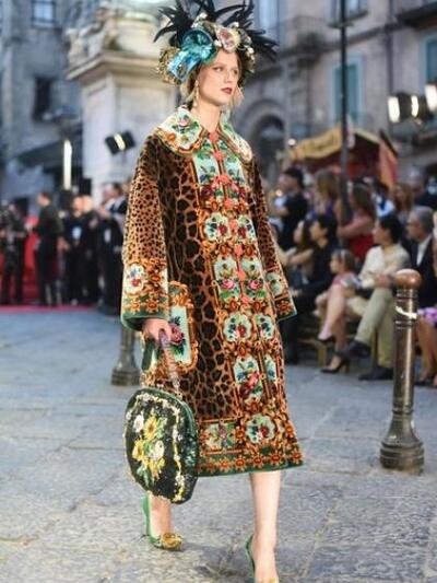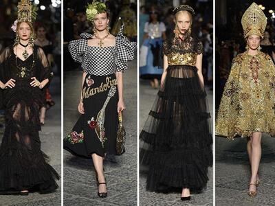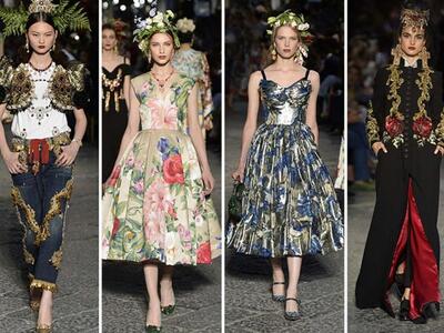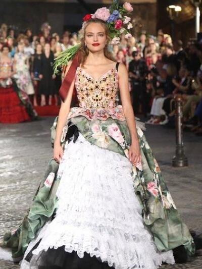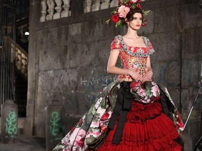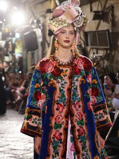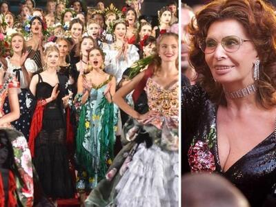«Οποτε σχεδιάζουμε, εκείνη έχουμε στο μυαλό μας» δήλωσαν οι Dolce e Gabbana για την 81χρονη Λόρεν που έφθασε στην πόλη με μίντι μαύρο κεντημένο φόρεμα του ομώνυμου οίκου. Μπροστά στην εκκλησία του San Gregorio Armeno, o δρόμος μετατράπηκε σε πασαρέλα. Κόκκινες βελούδινες κουρτίνες, μπαρόκ καρέκλες και τα γύρω μπαλκόνια υποδέχθηκαν τους 500 καλεσμένους των σχεδιαστών. Tα μοντέλα μάλλον δυσκολεύτηκαν να περπατήσουν. Είχαν πελώριο στολισμό στο κεφάλι: τιάρες που παρέπεμπαν στα θρησκευτικά αγάλματα της καθολικής εκκλησίας, στην ιταλική φύση και την φοκλορική παράδοση, ακόμα και στις τοπικές γεύσεις. Υπήρξε μοντέλο με καπέλο γλυκό «μπαμπά» με σαντιγί! Τα ρούχα ήταν λουλουδένια new retro φορέματα –κρινολίνα, κεντημένα μπούστα με τζιν παντελόνια, bustier πληθωρικές τουαλέτες, δαντελένια pin up μίντι.