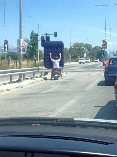 Η συγκεκριμένη φωτογραφία κάνει το γύρο του διαδικτύου τις τελευταίες ώρες προκαλώντας πάρα πολλά σχόλια αλλά και γέλια... Οδηγός και συνεπιβάτης του δίκυκλου μάλλον δεν σκέφτηκαν πολύ καλά το πως θα μεταφέρουν το τεράστιο στρώμα στο σπίτι τους... κάτι που τους ταλαιπώρησε ιδιαίτερα όπως φαίνεται από το χαρακτηριστικό στιγμιότυπο.