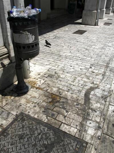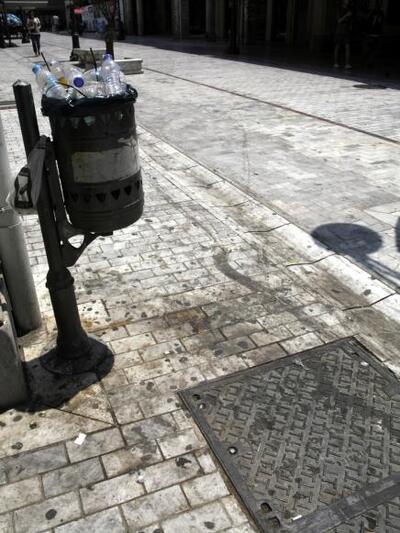 Παρατηρώντας λίγο καλύτερα διαπιστώνει κανείς ότι είναι εμφανή τα σημάδια απο τις σακούλες απορριμάτων των εστιατορίων και καφέ που προφανώς ...στάζουν όταν τις ...σέρνουν για να τις τοποθετήσουν στους κάδους.