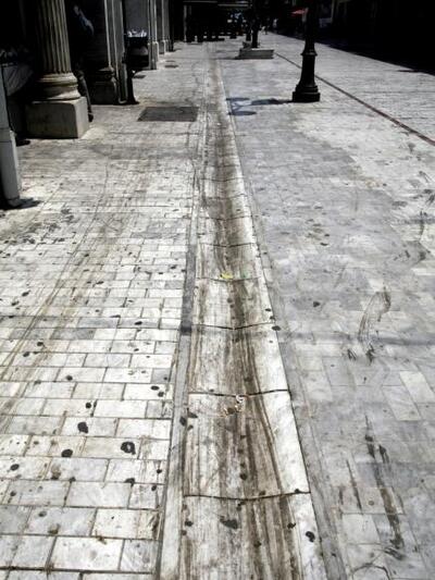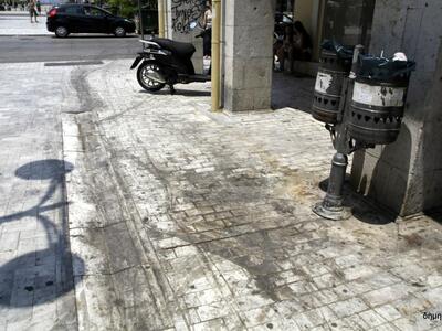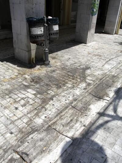 Στο κέντρο της Πάτρας, στον πιο γνωστό, κεντρικό και ιστορικό πεζόδρομο της πόλης, υπάρχει ένα σημείο που αποτελεί πραγματικά ντροπή. Λίγο πριν τη διασταύρωση με την Αγίου Ανδρέου, μεταξύ Ρήγα Φεραίου και Αγίου Ανδρέου, στην δεξιά πλευρά του πεζοδρόμου όπως κατεβαίνουμε προς το λιμάνι τα μαρμαροπλακάκια είναι κατάμαυρα απο την βρωμιά, κολάνε και δημιουργούν αποκρουστική τριτοκοσμική εικόνα.