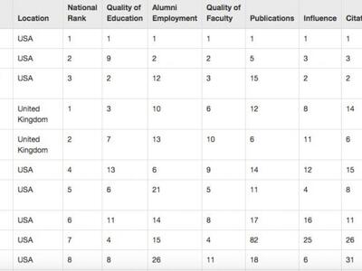 Για να βγει η κατάταξη με τα καλύτερα πανεπιστήμια του κόσμου, το CWUR χρησιμοποιεί οχτώ δείκτες, ανάμεσά τους η ποιότητα εκπαίδευσης, η απασχόληση των αποφοίτων και η επιρροή. Στη δεύτερη θέση, πίσω από το Χάρβαρντ, βρίσκεται το Στάνφορντ και το ΜΙΤ, ακολουθούν τα δυο κορυφαία βρετανικά πανεπιστήμια, Κέμπριτζ και Οξφόρδη, έκτο είναι το Κολούμπια και έβδομο το Μπέρκλεϊ και την πρώτη 10αδα κλείνουν το πανεπιστήμιο του Σικάγο, το Πρίνστον και το Γέιλ.