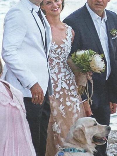 H νύφη, φορούσε ένα υπέροχο νυφικό από το ατελιέ της Μαρίας Κονίδη και έλαμπε από ευτυχία. Μετά την τελετή οι δυο τους έφυγαν με βέσπα, με προορισμό το Kaiki Beach, όπου έγινε το γαμήλιο πάρτι.Εκεί προβλήθηκε ένα χιουμοριστικό βίντεο με φωτογραφίες και στιγμιότυπα από τη ζωή τους με μουσικό χαλί την «Ιστορία των Olympians». Στη συνέχεια, μετά το φαγοπότι, ο Θάνος μεταμφιέστηκε σε Τόνυ και έδωσε ένα πριβέ show με την ομάδα του για τους φίλους και τους συγγενείς του που δεν σταμάτησαν να χορεύουν στιγμή.