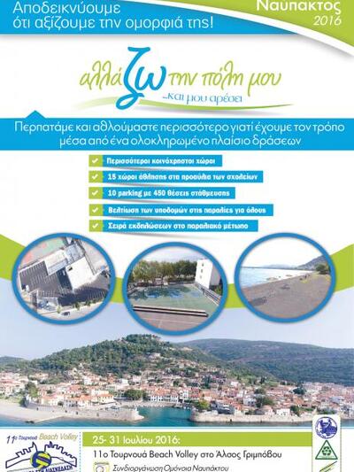 Ο Δήμος Ναυπακτίας, συνεχίζοντας τις δράσεις, στο πλαίσιο της καμπάνιας «ΑλλάΖΩ την πόλη μου… και μου αρέσει», επιλέγει αυτή τη φορά να σταθεί αρωγός σε μία διοργάνωση θεσμό που εδώ και έντεκα χρόνια λαμβάνει χώρα με απόλυτη επιτυχία στην πόλη της Ναυπάκτου. Συγκεκριμένα συνδιοργανώνει με την Ομόνοια Ναυπάκτου το «11ο Τουρνουά Beach Volley», το οποίο θα πραγματοποιηθεί στο Άλσος του Γριμπόβου από τις 25 έως τις 31 Ιουλίου 2016.